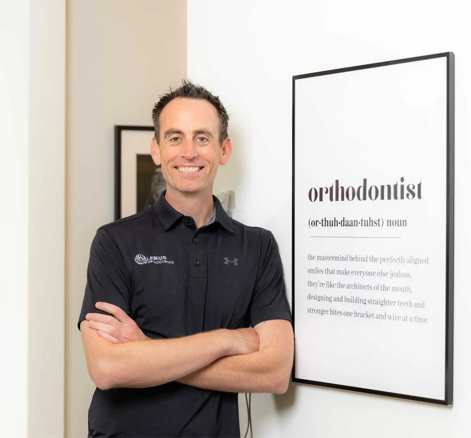 At Lenius Orthodontics in Overland Park, KS, a man in a black polo stands arms crossed by a framed "orthodontist" sign representing an Invisalign Expert.